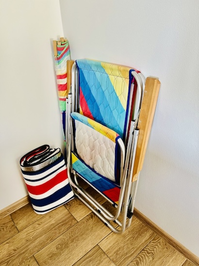 - koc plażowy, dwa leżaki, parawan.